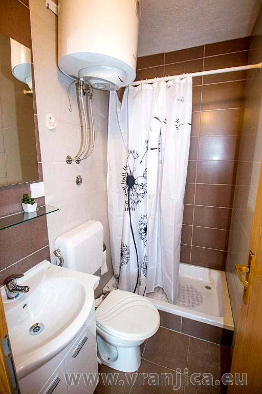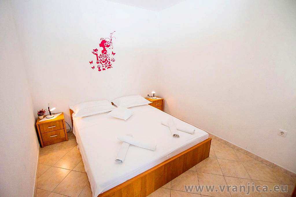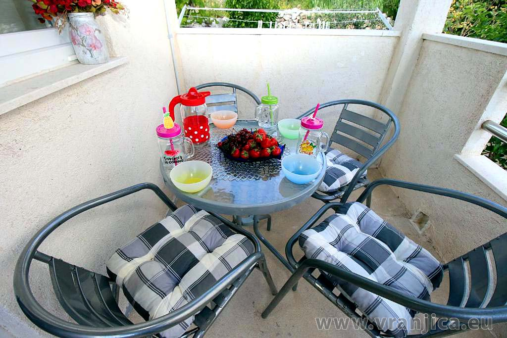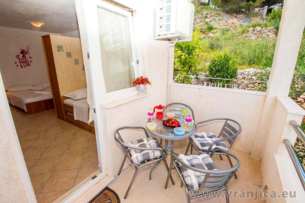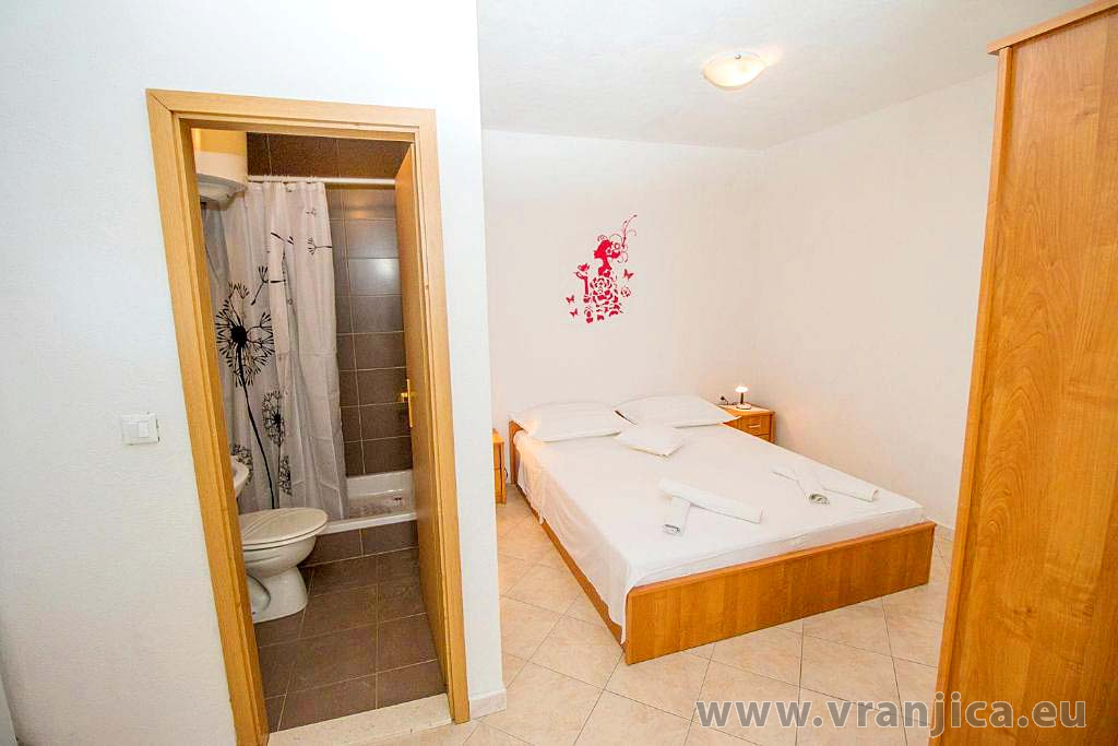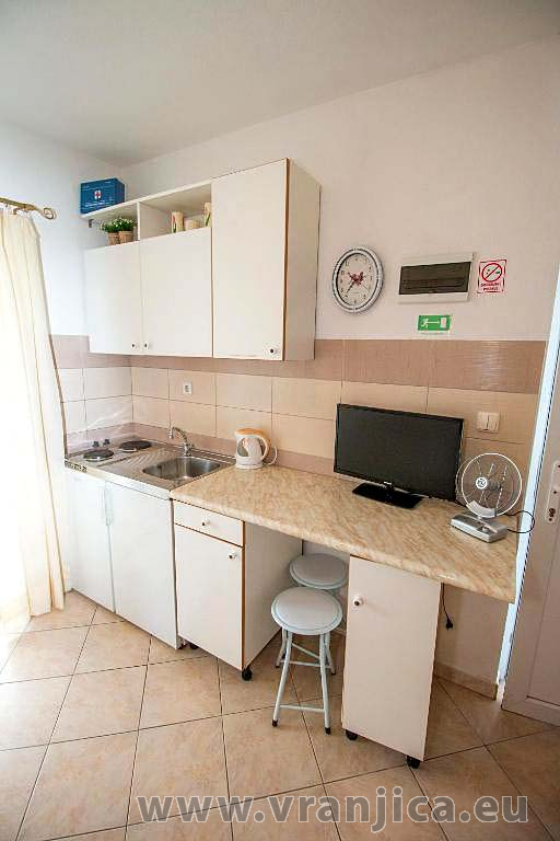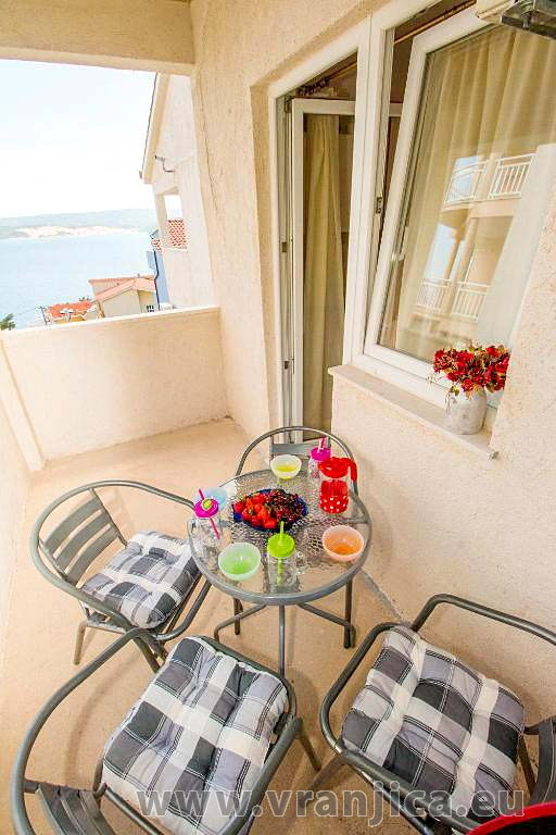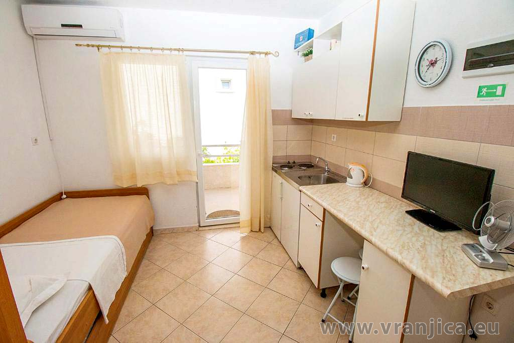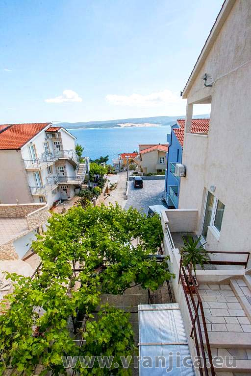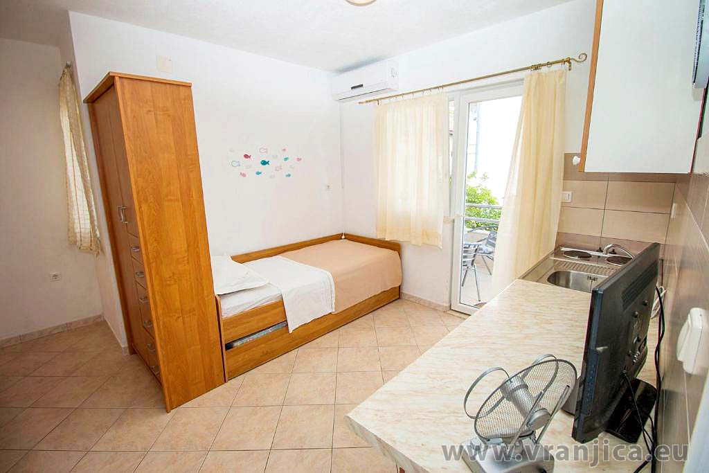 AP2 studio (2+1) pro 3 osoby - 2. patro, 1 velký pokoj (1x dvoulůžko + 1 samostatná postel), + kuchyně, koupelna (WC, sprcha), boční terasa s výhledem na moře a do zahrady, plocha 25 m2. Informace o objektu ZDE.