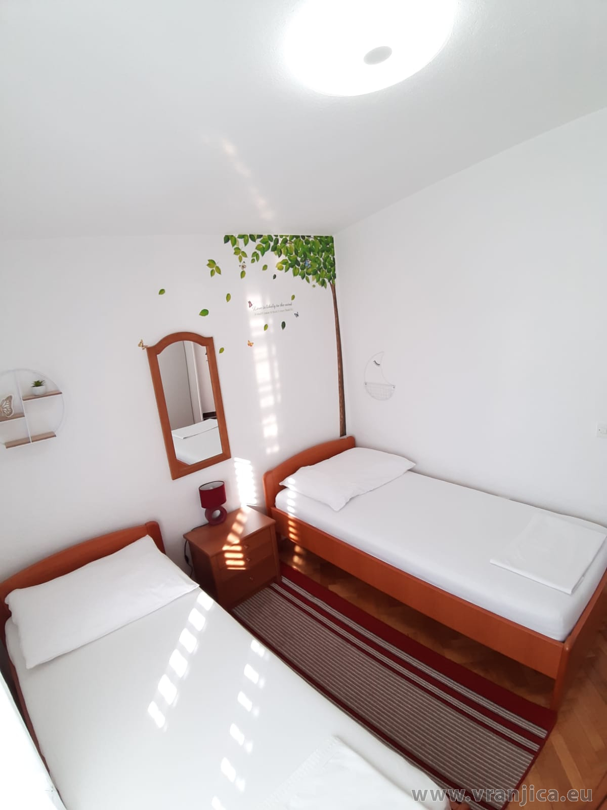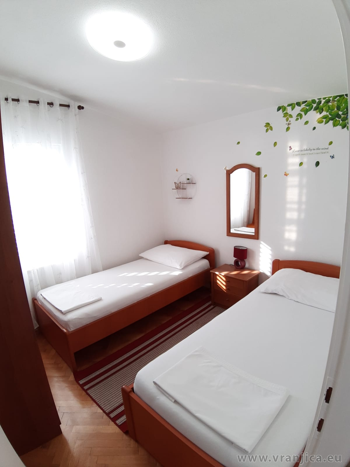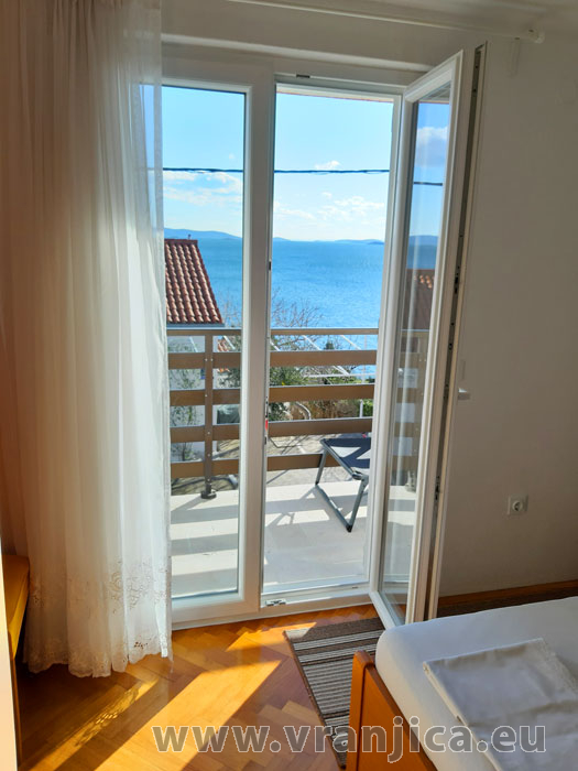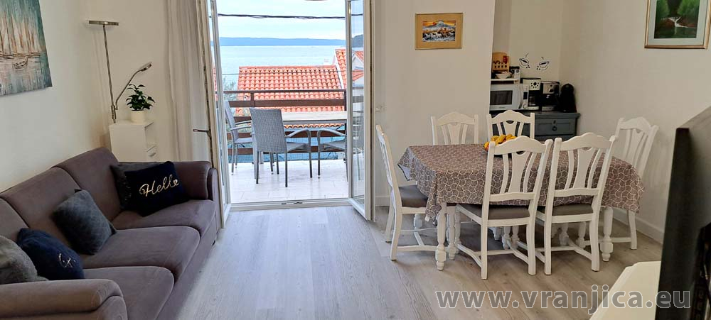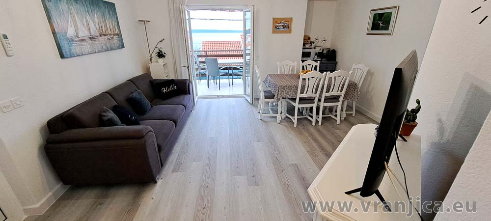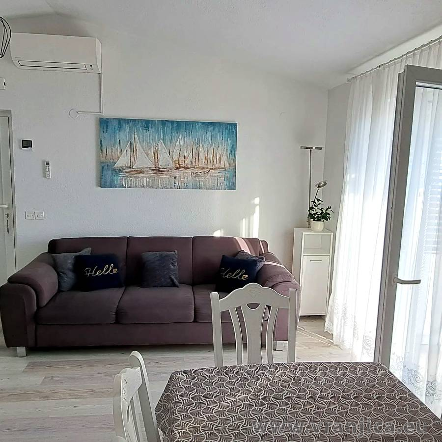AP1 (4+1) pro 4 dospělé + 1 dítě - 2 ložnice (1. pokoj 1x dvoulůžko, 2. pokoj 2 oddělené postele), obývací pokoj (rozkládací pohovka pro 1 osobu), jídelní kout, nová kuchyně, koupelna (vana, wc), terasa s výhledem na moře. Terasa je průchozí z ložnice a obývacího pokoje a je chráněna před sluncem vysouvací pergolou. Celková plocha včetně terasy cca 65 m2. Informace o objektu ZDE.