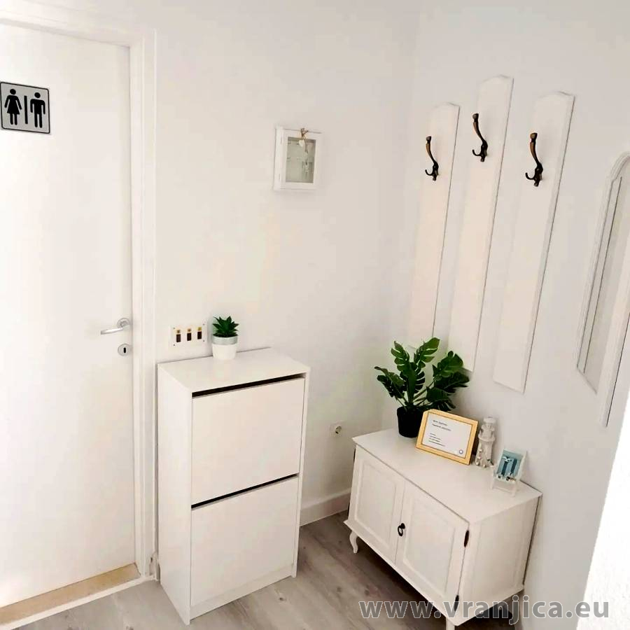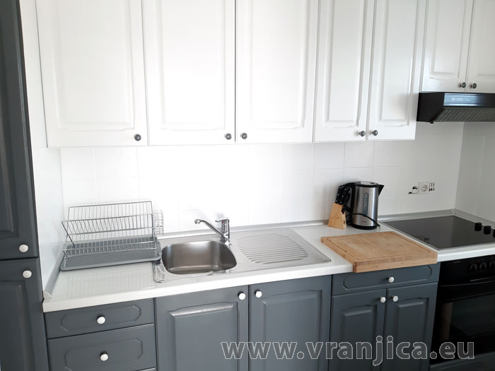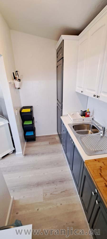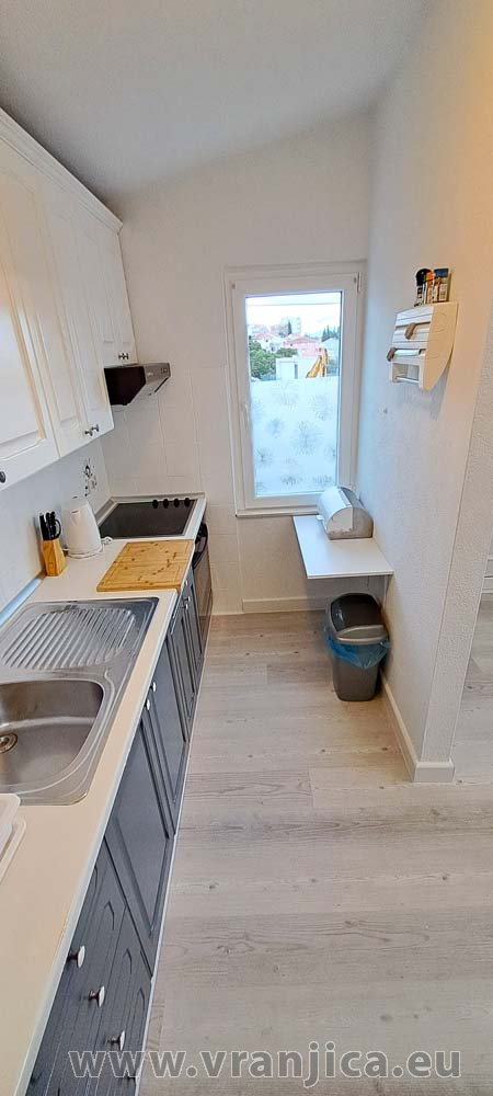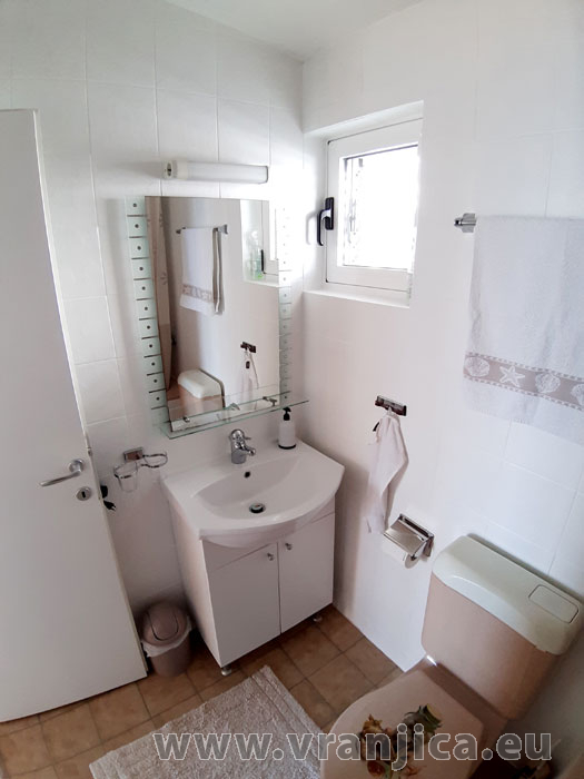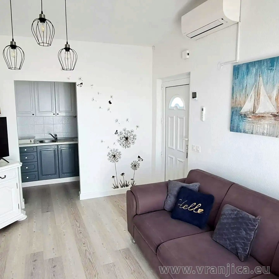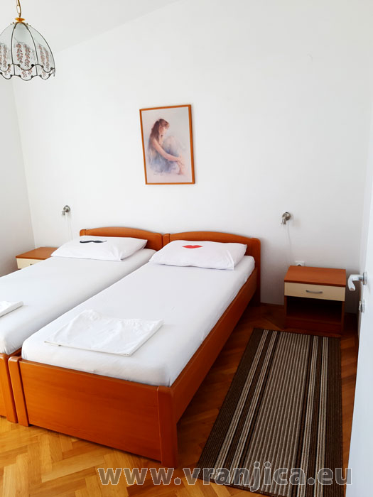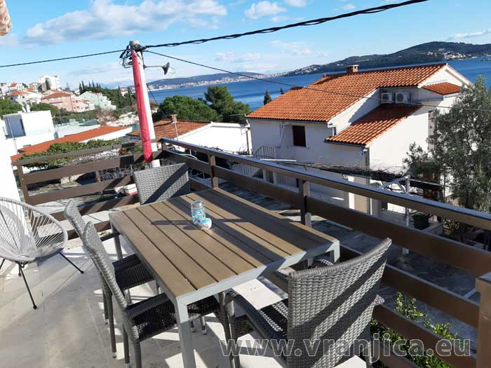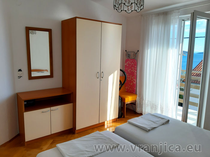 AP1 (4+1) pro 4 dospělé + 1 dítě - 2 ložnice (1. pokoj 1x dvoulůžko, 2. pokoj 2 oddělené postele), obývací pokoj (rozkládací pohovka pro 1 osobu), jídelní kout, nová kuchyně, koupelna (vana, wc), terasa s výhledem na moře. Terasa je průchozí z ložnice a obývacího pokoje a je chráněna před sluncem vysouvací pergolou. Celková plocha včetně terasy cca 65 m2. Informace o objektu ZDE.