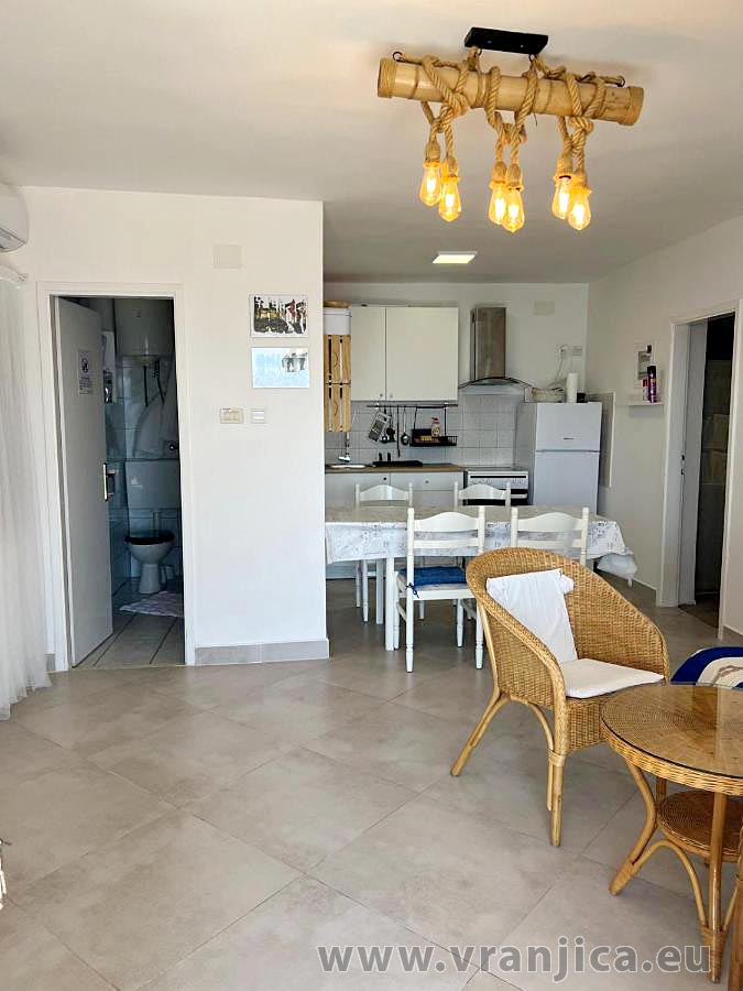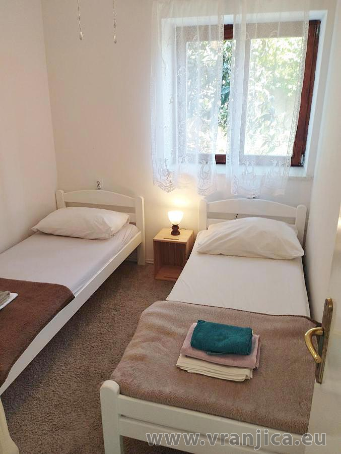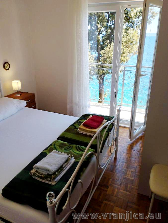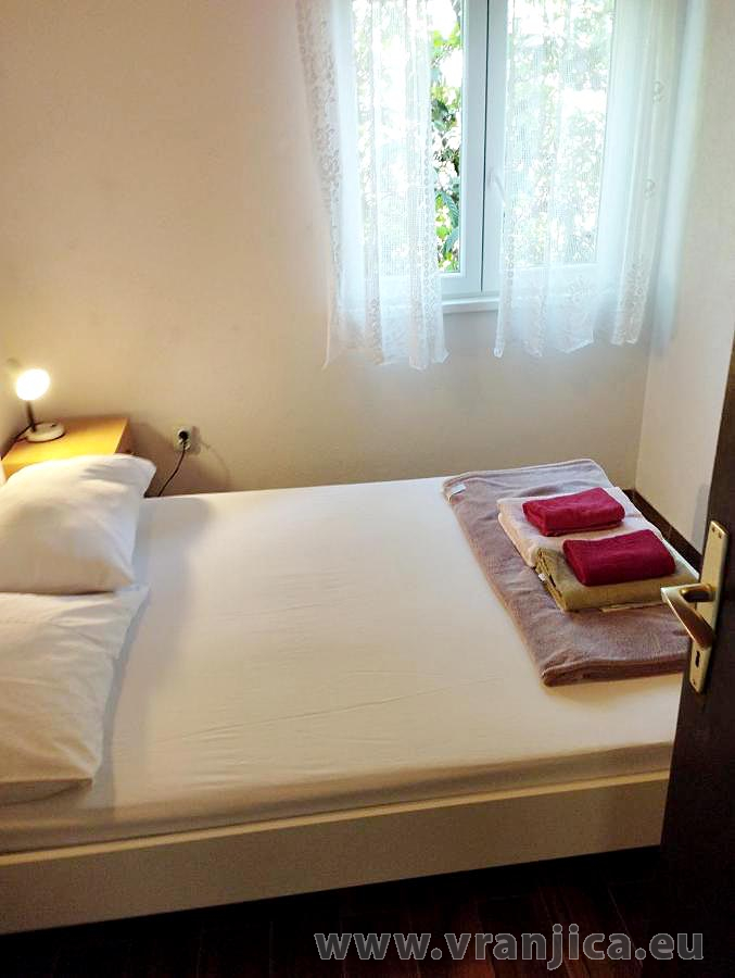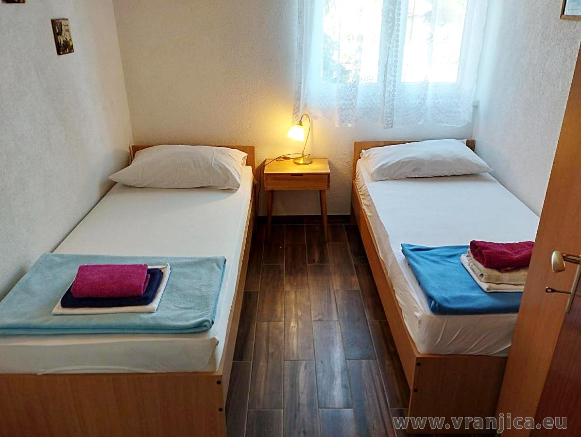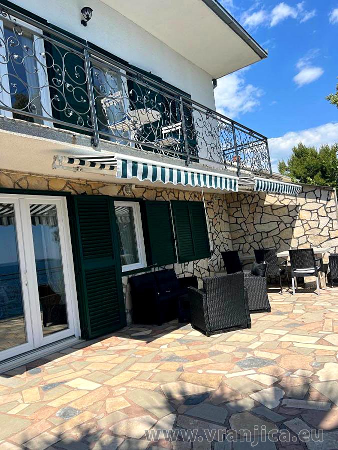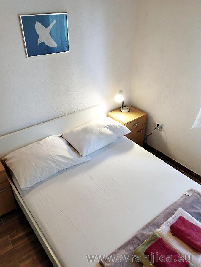 Přízemí: AP2 (4) pro 4 osoby, 2 ložnice (1. pokoj 1x dvoulůžko, 2. pokoj 2 oddělené postele), kuchyně, koupelna (sprcha, wc), terasa s výhledem na moře. Velikost 45 m2, terasa 35 m2.