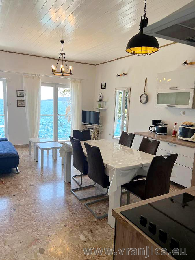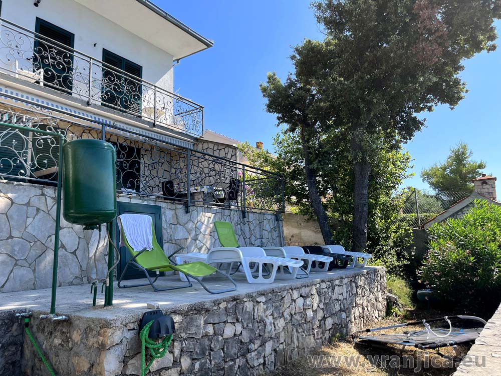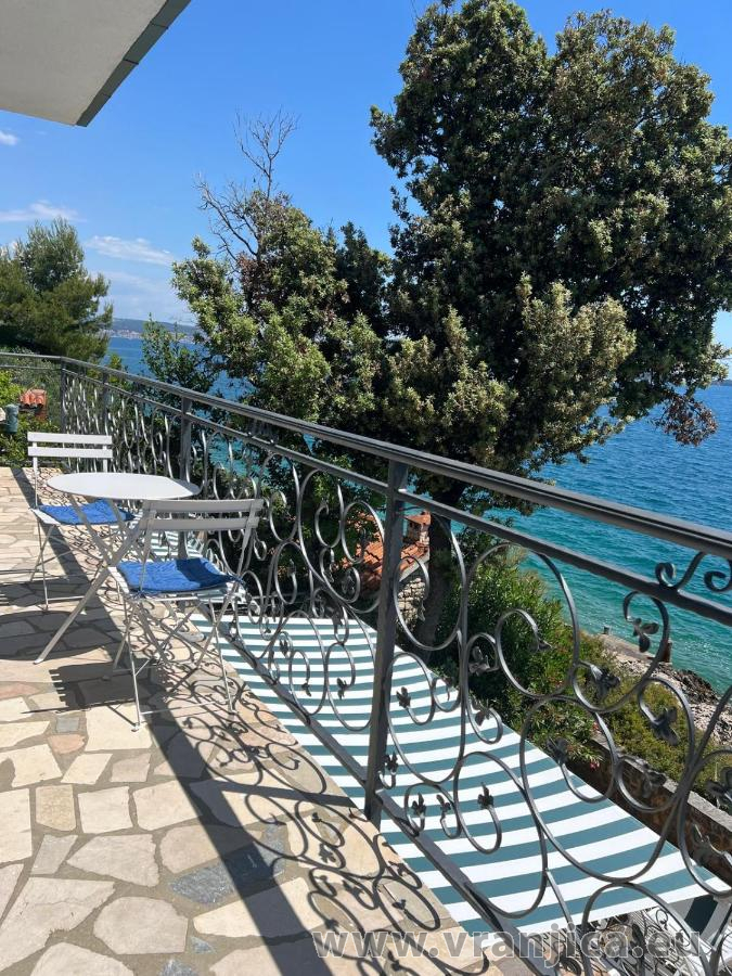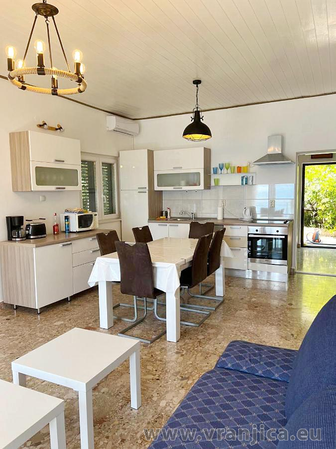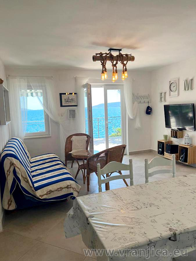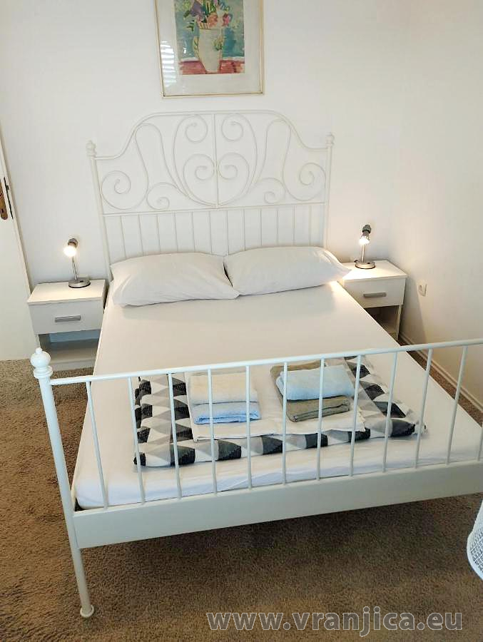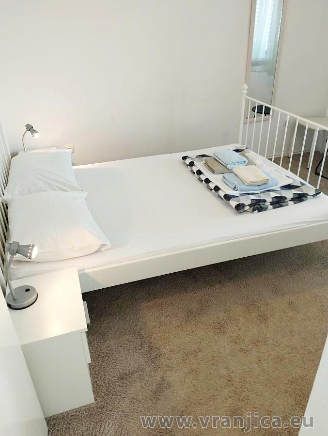 Přízemí: AP2 (4) pro 4 osoby, 2 ložnice (1. pokoj 1x dvoulůžko, 2. pokoj 2 oddělené postele), kuchyně, koupelna (sprcha, wc), terasa s výhledem na moře. Velikost 45 m2, terasa 35 m2.