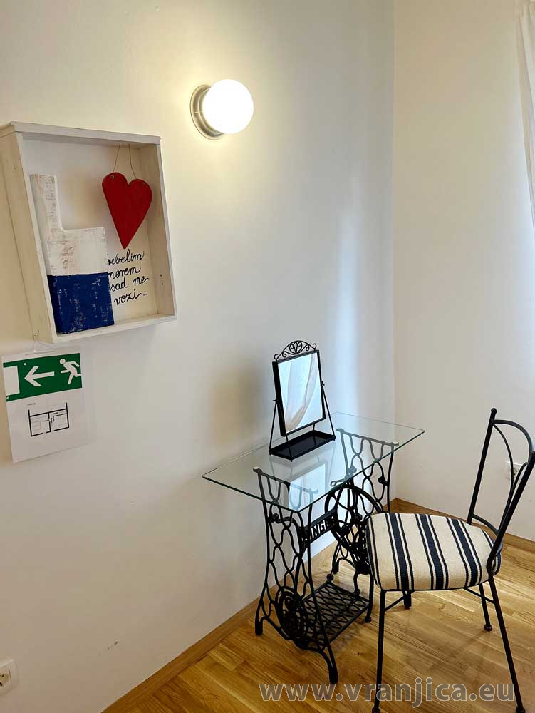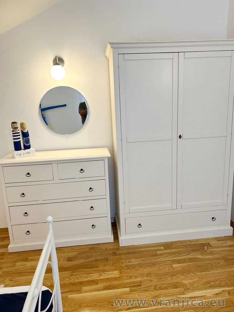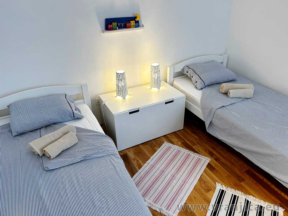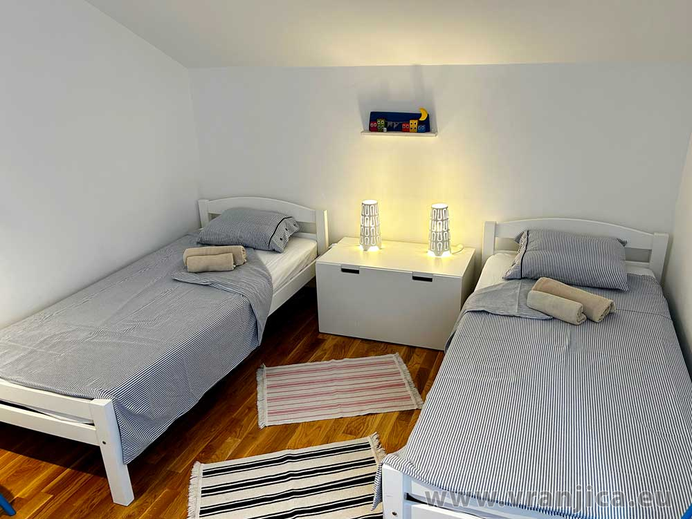 1. patro: 2 samostatné pokoje (1 pokoj 1x dvolůžko + 1 postel, 2. pokoj 2 oddělená lůžka). Na přání k dispozici dětská postýlka a fén.