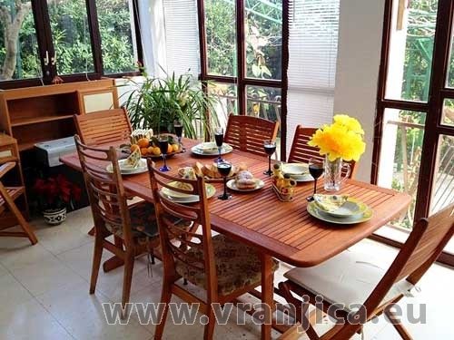 Přízemí: kuchyně, obývací pokoj, (koupelna, WC), 1 ložnice (1x dvoulůžko, 1x samostatná postel), velká veranda, zahradní terasa