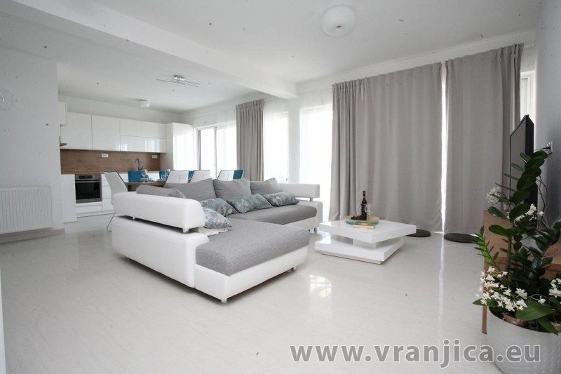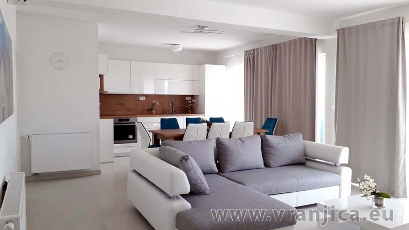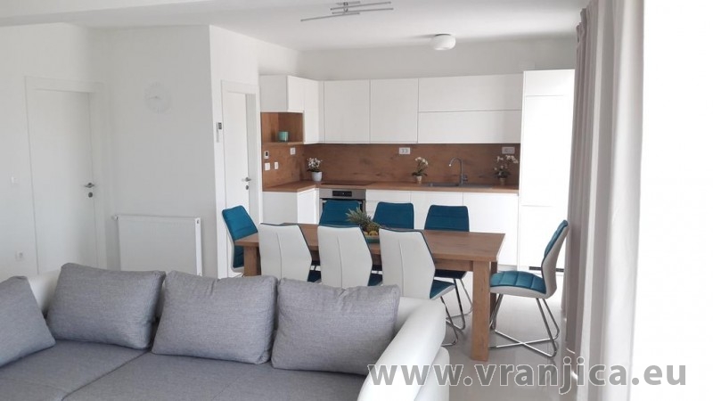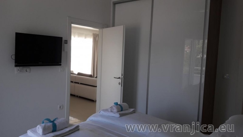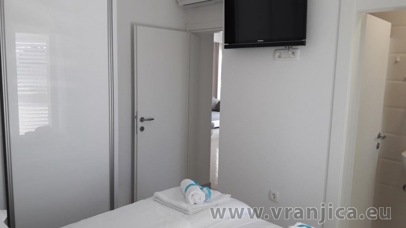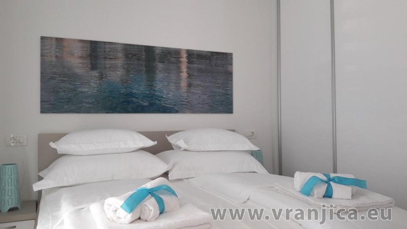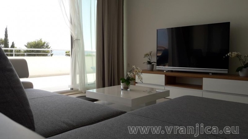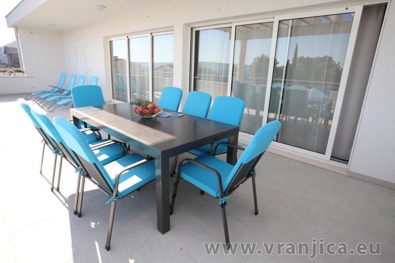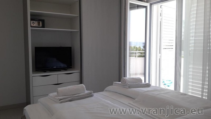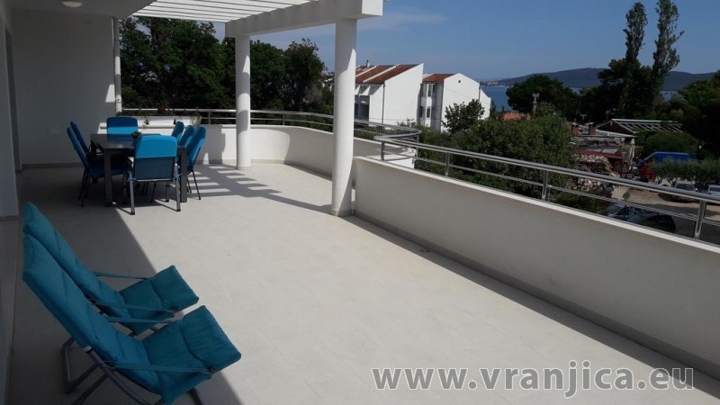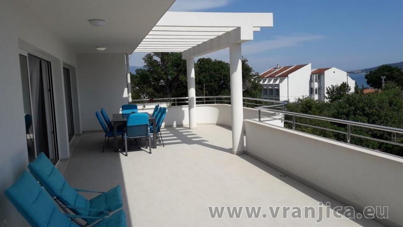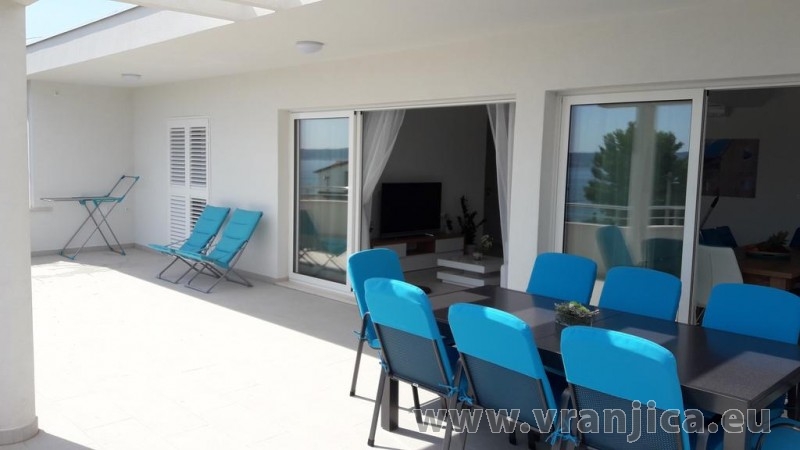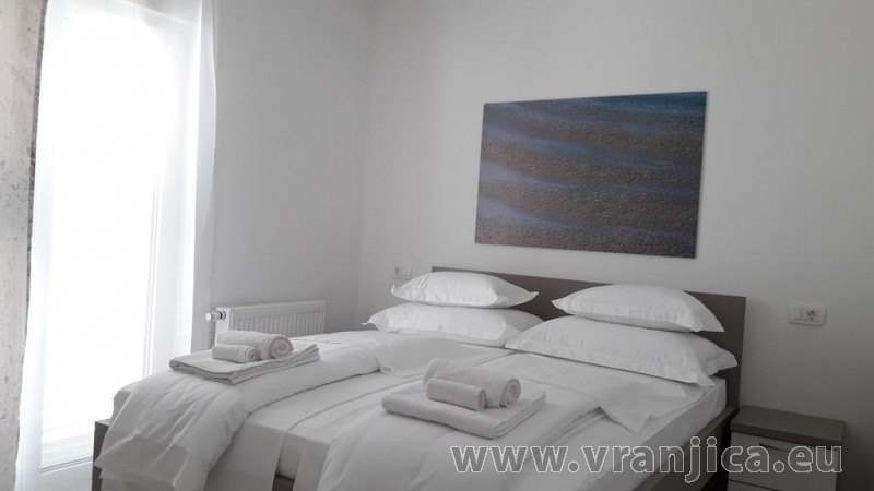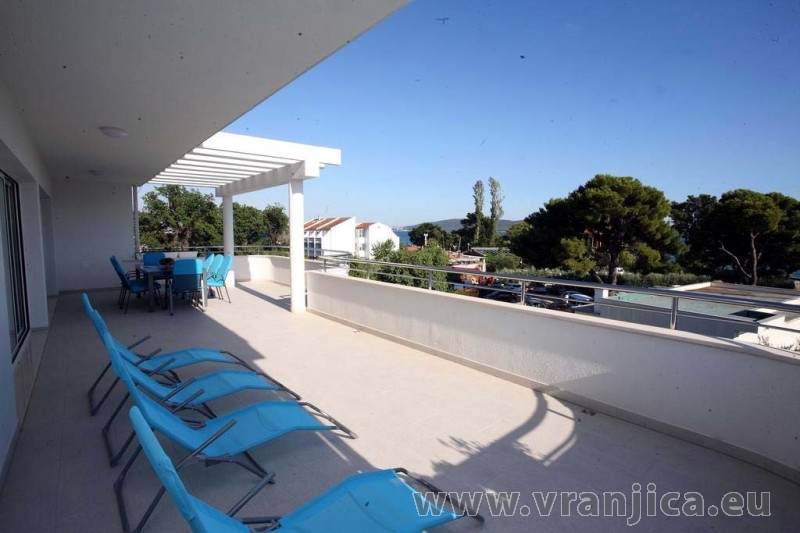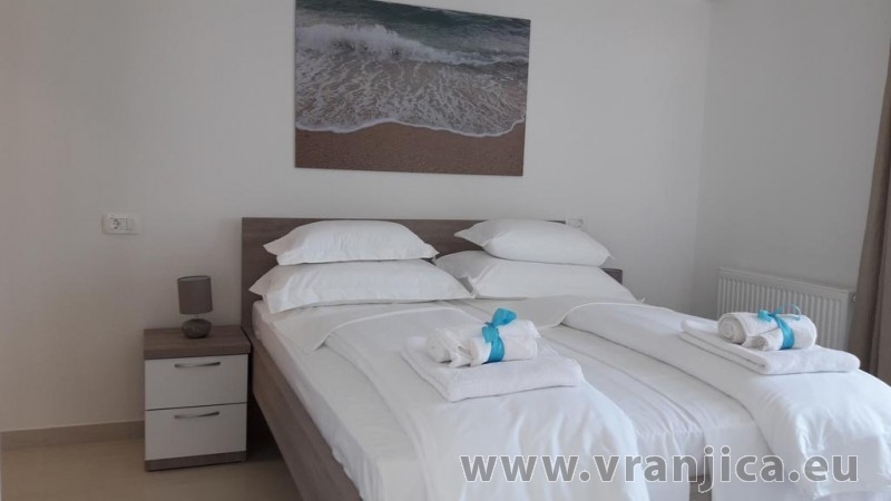 AP1 (6+1) pro 7 osob včetně dětí - 2. patro, 3 ložnice (3x dvoulůžko), obývací pokoj (rozkládací pohovka) + kuchyně, terasa s výhledem na moře, 3x kopelna + 3x wc. (Každá ložnice má samostatnou koupelnu + wc.) Plocha cca 100 m2, 1. terasa 50 m2, 2. terasa 10 m2. Informace o objektu ZDE.